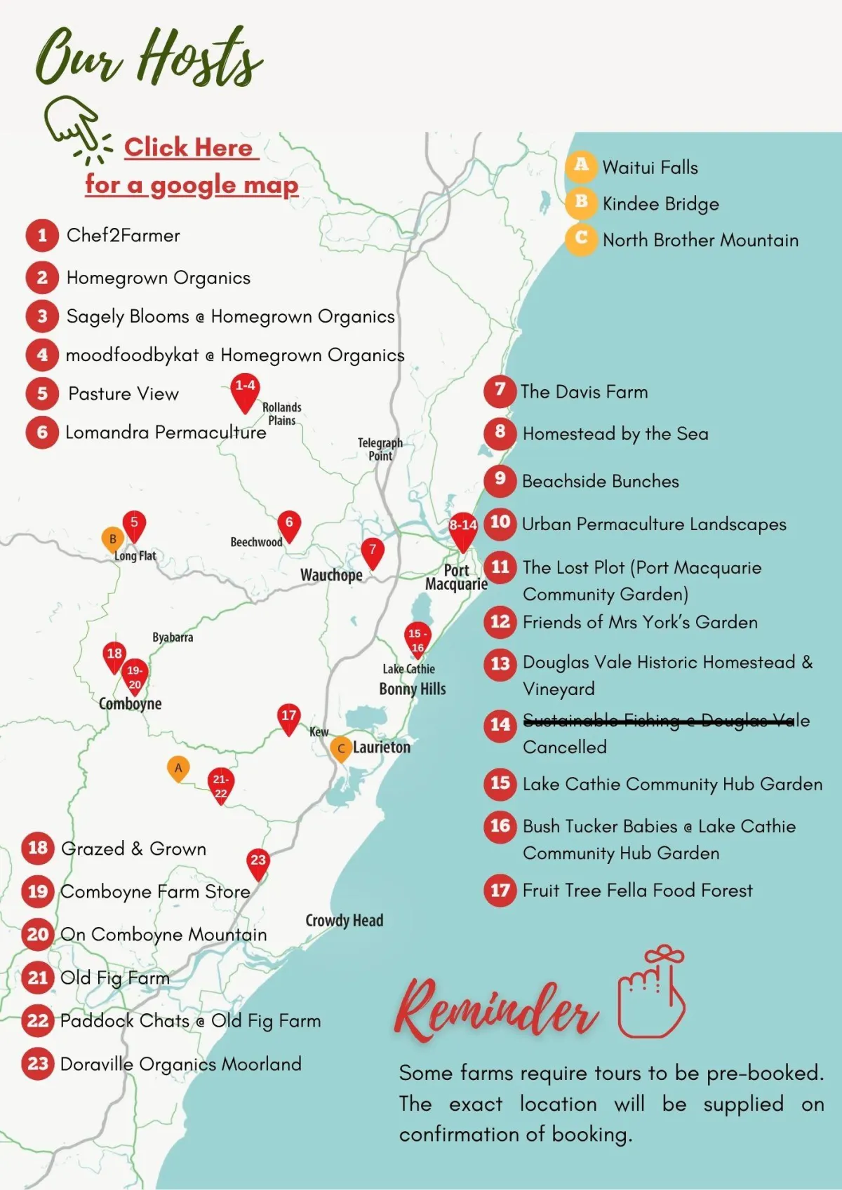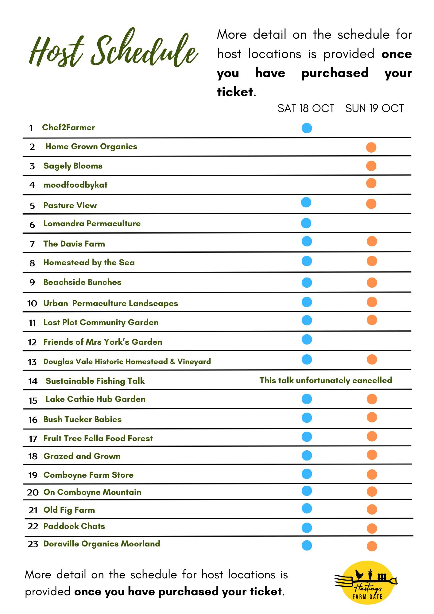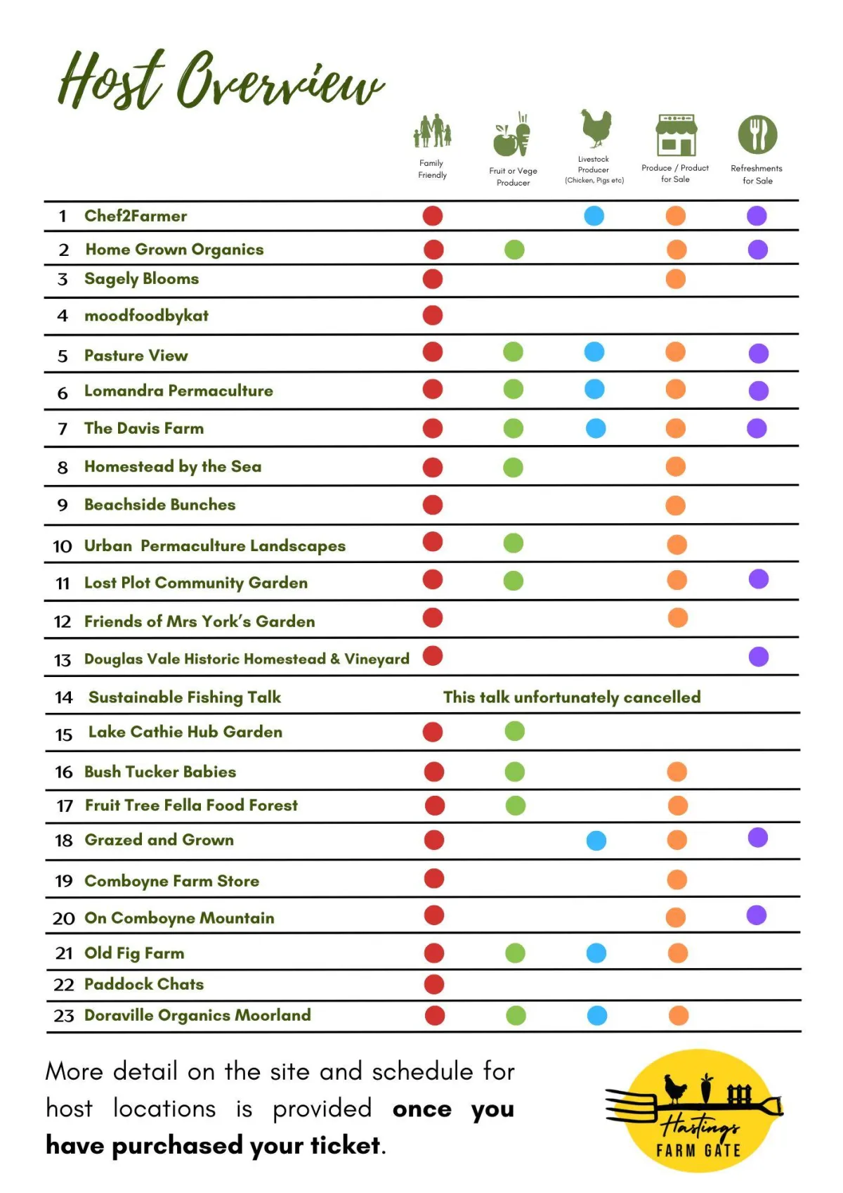 Over the weekend 18-19 October 23 events are available providing a diverse array of farm and garden experiences. Check out this year’s hosts on the map and the overview below more detail once you purchase your ticket. Don’t try and get to all of them. It’s impossible!